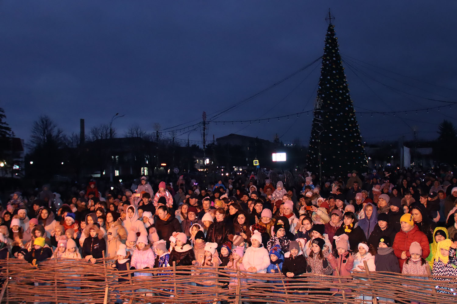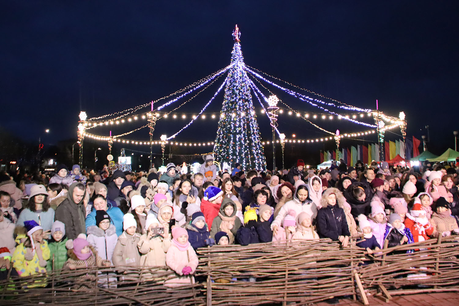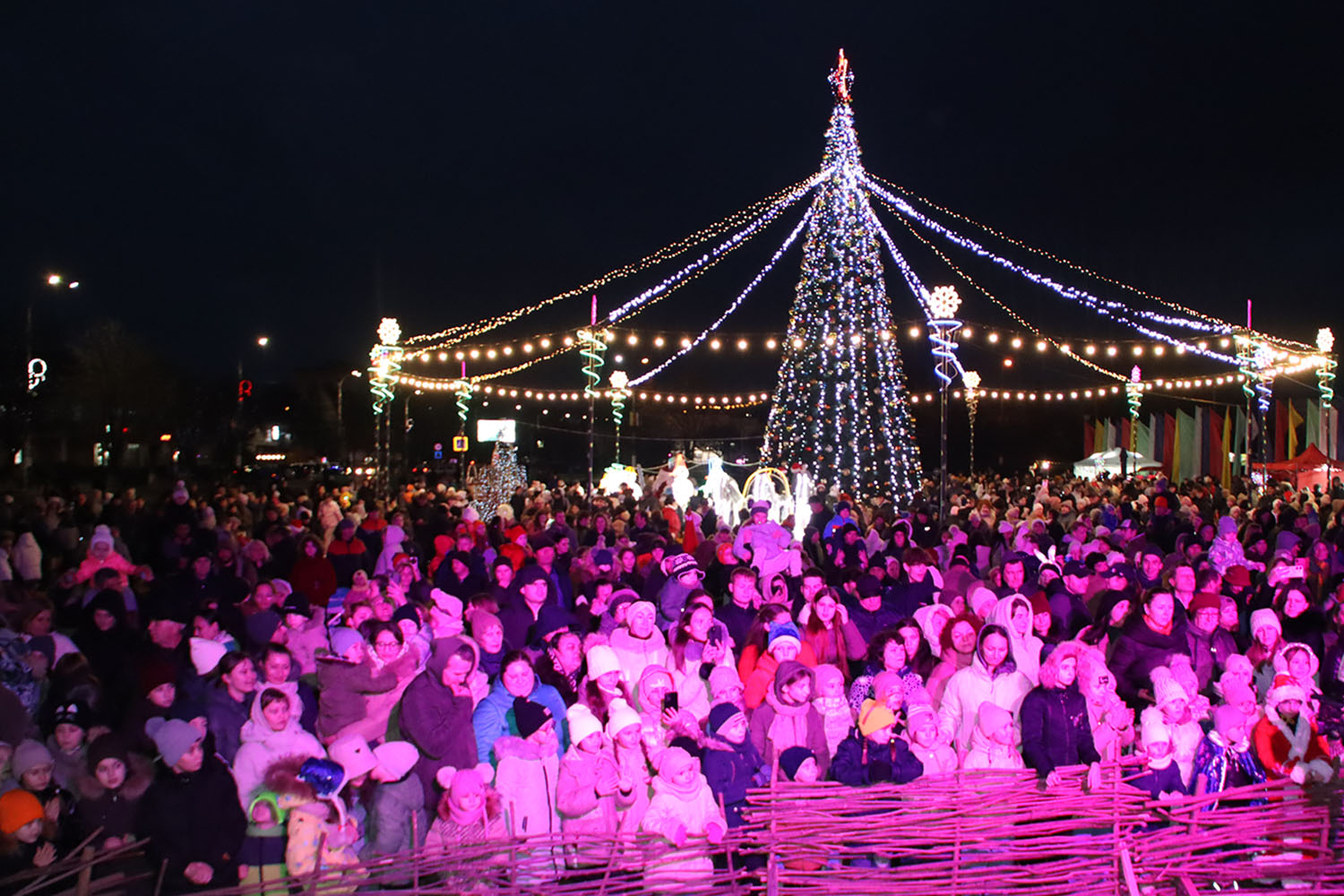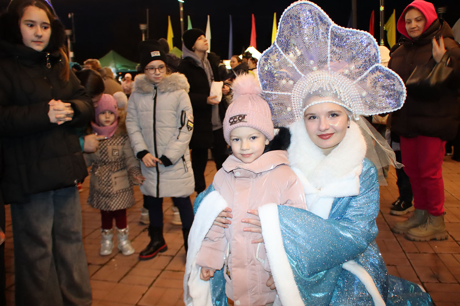 На площади Победы участников шествия уже ждали дети и взрослые, а также главная ёлка города — 12-метровая красавица, украшенная десятками разноцветных шаров и гирлянд.