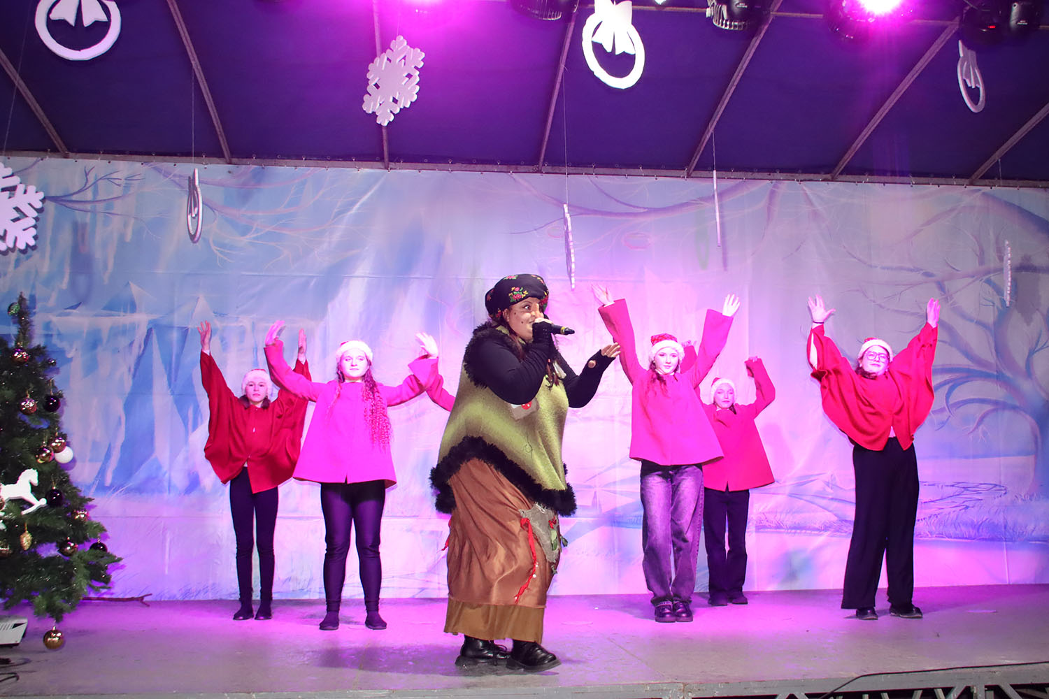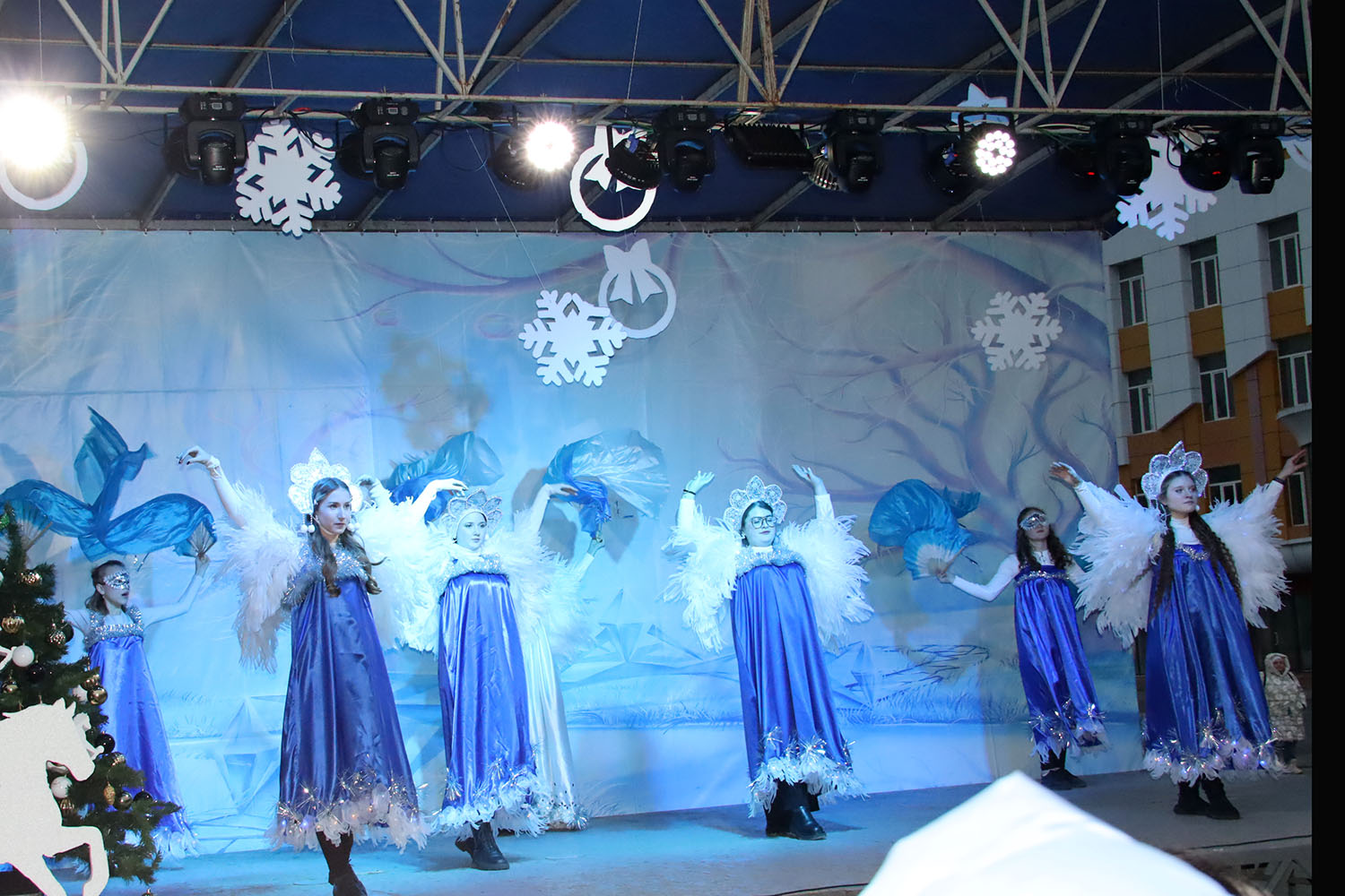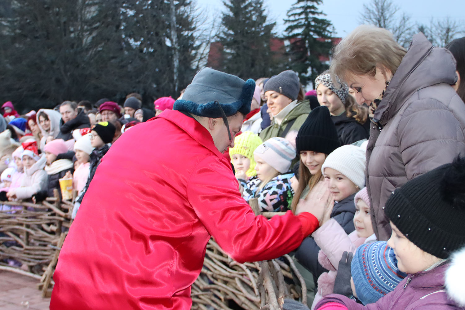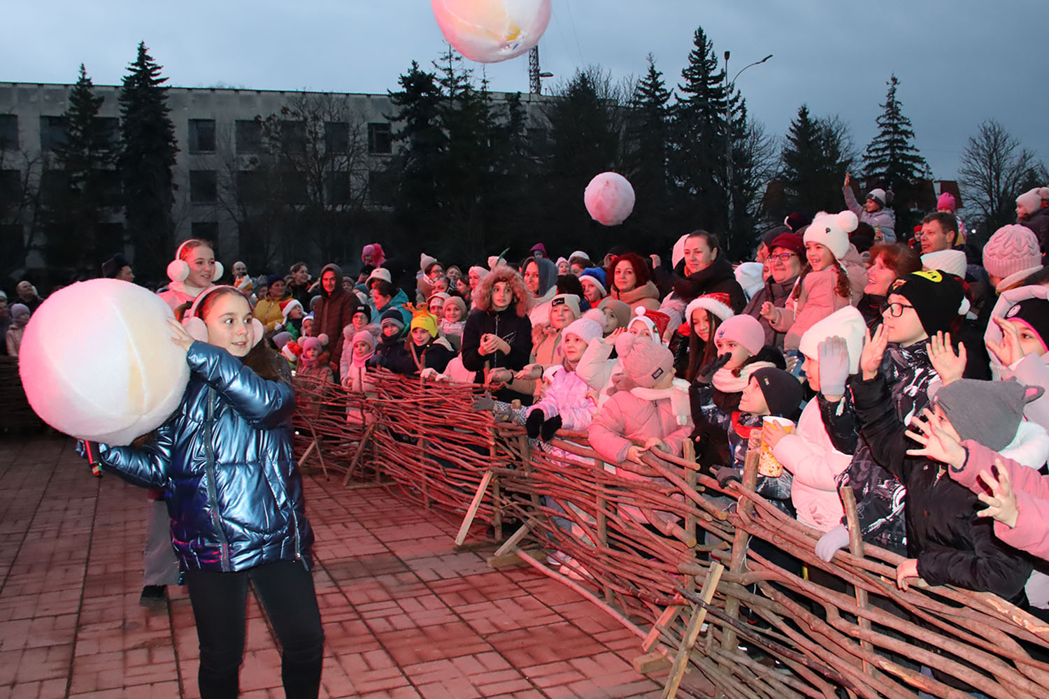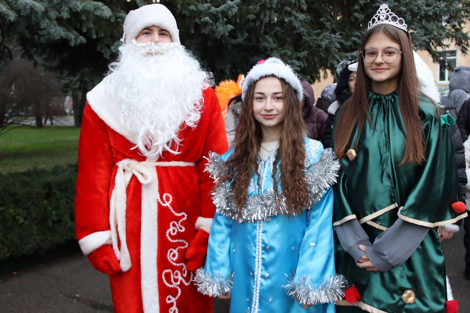 На площади Победы участников шествия уже ждали дети и взрослые, а также главная ёлка города — 12-метровая красавица, украшенная десятками разноцветных шаров и гирлянд.