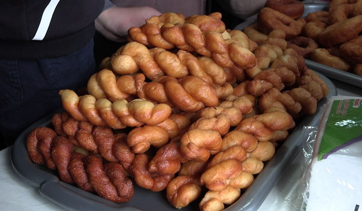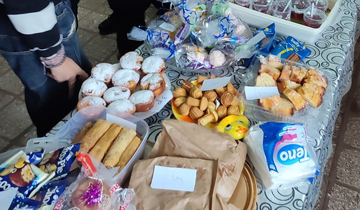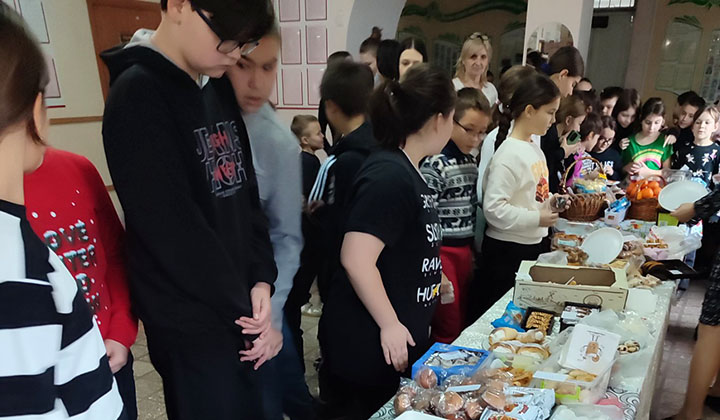 На протяжении многих лет в русской средней школе № 2 проходит благотворительная ярмарка «В канун Нового года». 17 декабря на импровизированных прилавках учащиеся 1–4 классов разложили угощения, приготовленные вместе с мамами и бабушками. Чего здесь только не было: пирожные, торты, блины и пироги с разной начинкой, желе в стаканчиках и печенье. Цены — символические. Настоящий праздник для сластён.