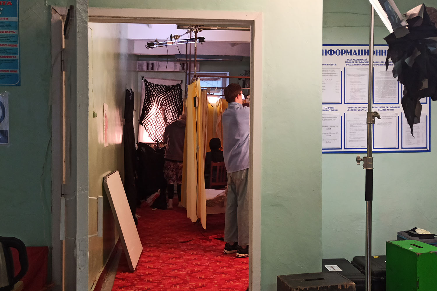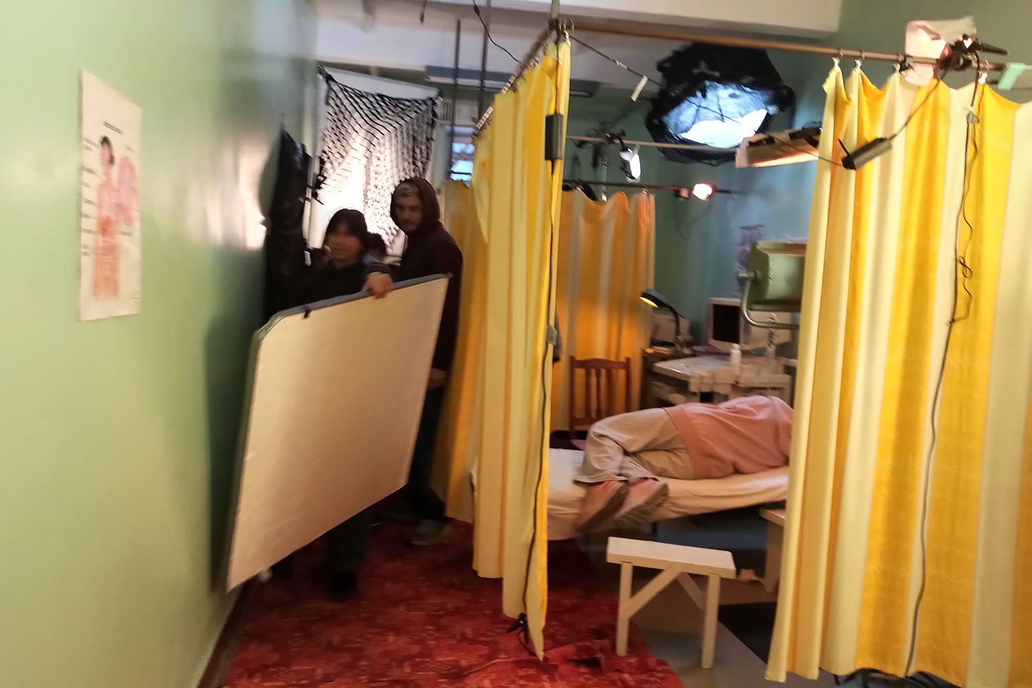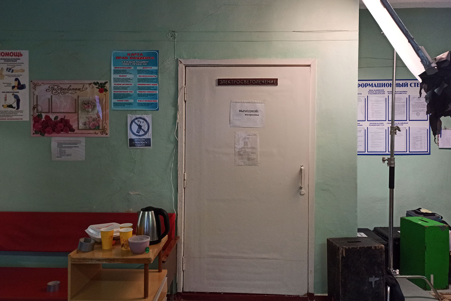 Камера запечатлела и физиотерапевтическое отделение местной больницы, где снимали завершающие сцены, к слову, в это время коллектив отделения продолжал работать в обычном формате.