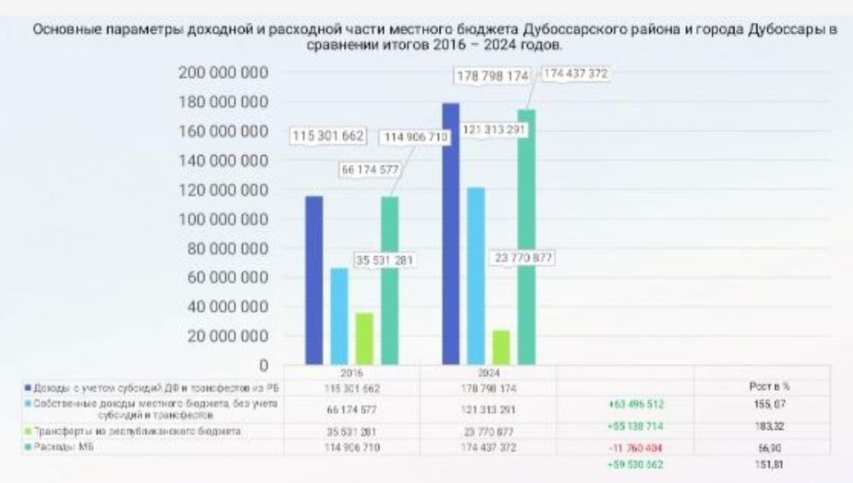 В ходе выступления Руслан Чабан представил также информацию об основных итогах работы за период, начиная с 2017 года. В частности, глава подчеркнул, что Дубоссары на протяжении всех этих лет показывали рост доходов местного бюджета.