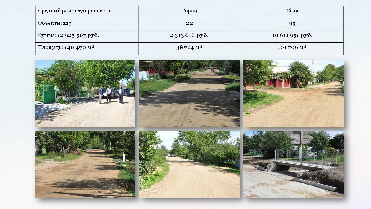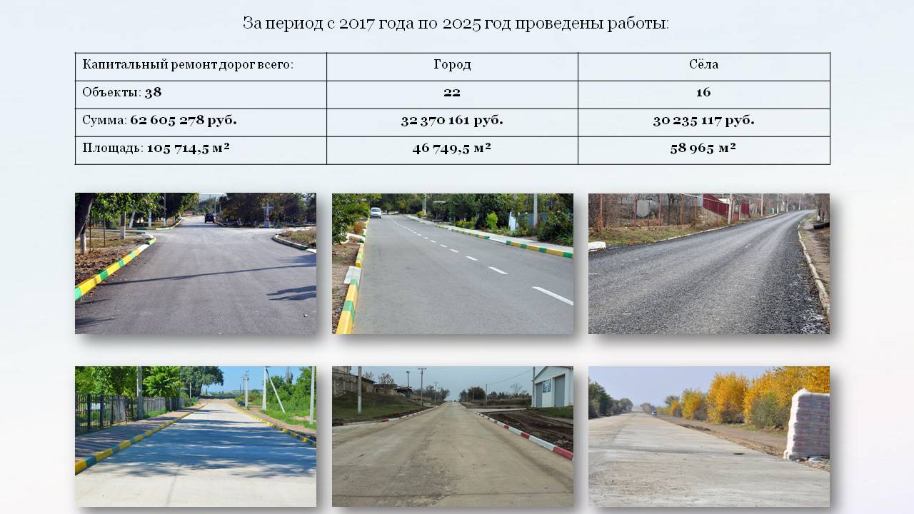 За период с 2017 по 2025 годы в городе и сёлах района проведены работы по капитальному ремонту 38 дорог. Средний ремонт выполнен на 117 дорогах.