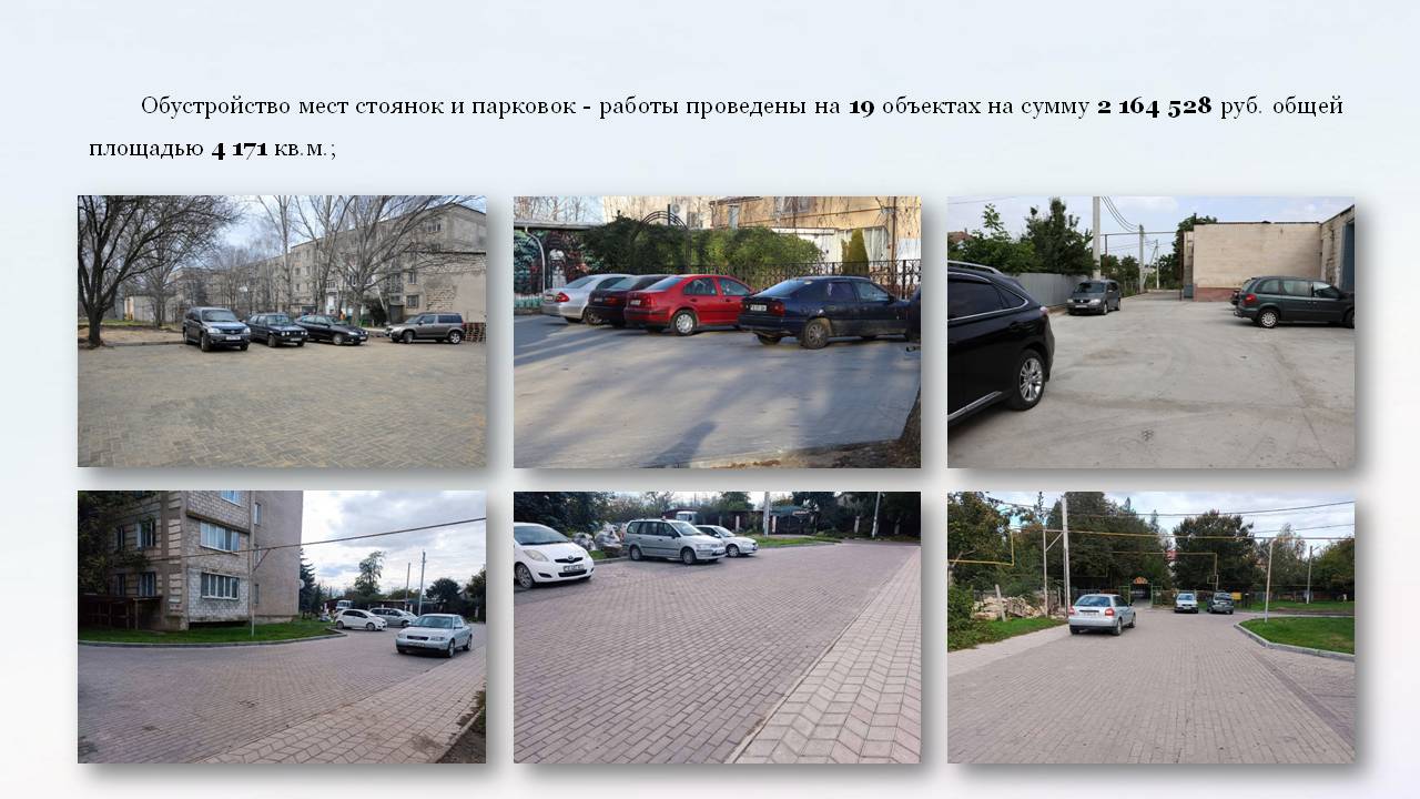 Внимание уделяется обустройству стоянок и парковок. Работы проведены на 19 объектах на сумму 2 164 528 руб. общей площадью 4 171 кв.м.