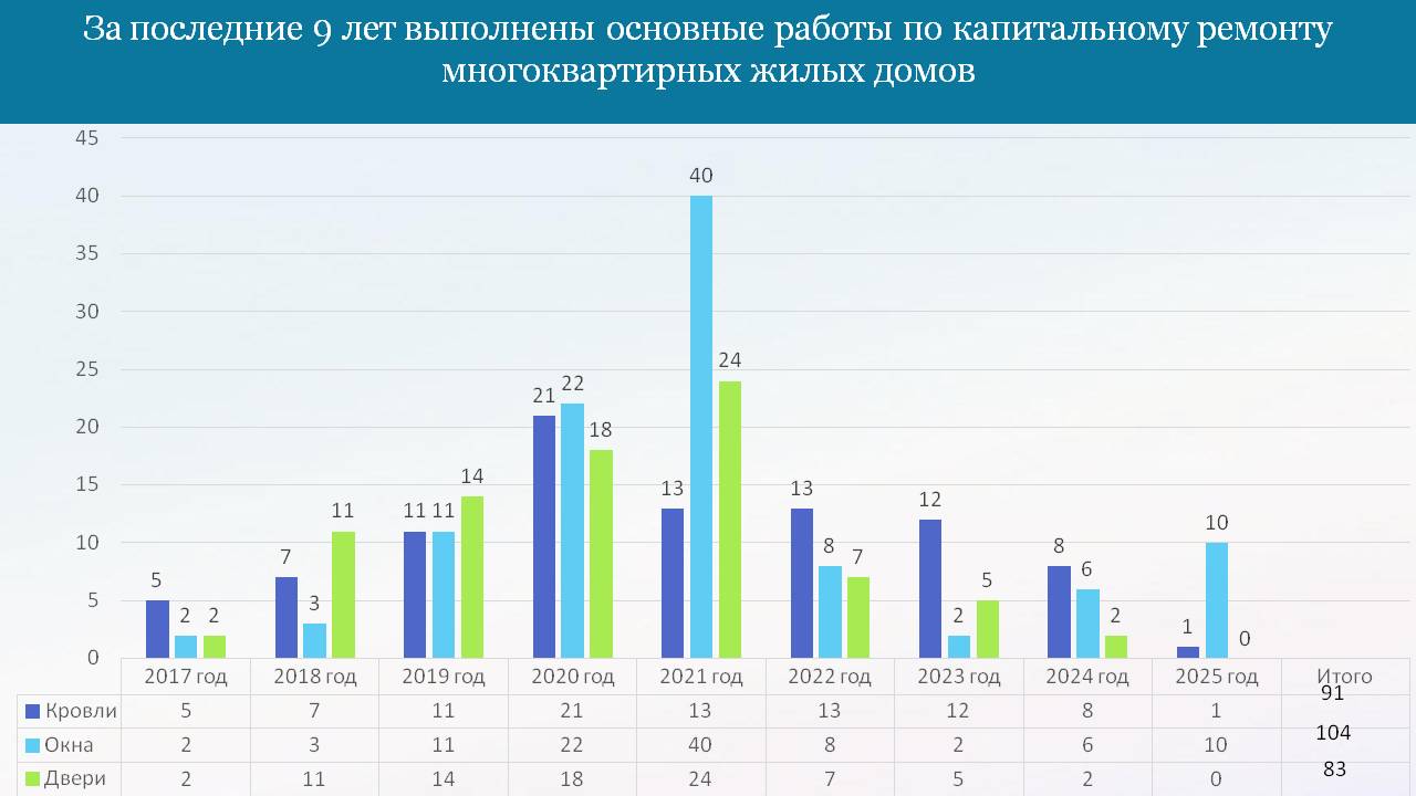 Так, в 2025 году в 59-ти многоквартирных жилых домах были выполнены работы по текущему ремонту на общую сумму 258 664, 68 руб., в том числе, выполнены работы по ремонту подъездов, изготовлению и монтажу козырьков над входами в подъезды, изготовлению и установке защитных решёток лестничных маршей между этажами, а также текущий ремонт кровель.