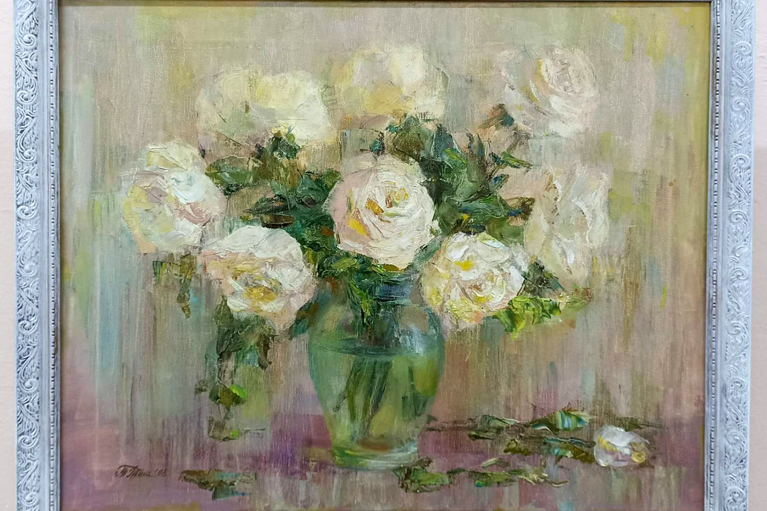 «Мы давно дружим, и мне было особенно приятно выставляться вместе с коллегами. Я люблю писать цветы — для меня это символ духовного возрождения. Весной земля наполняется красками, и хочется передать это восхищение в работах. Мне близки акварель и масло, где есть элемент непредсказуемости. Зимой часто работаю по фотографиям и воспоминаниям».